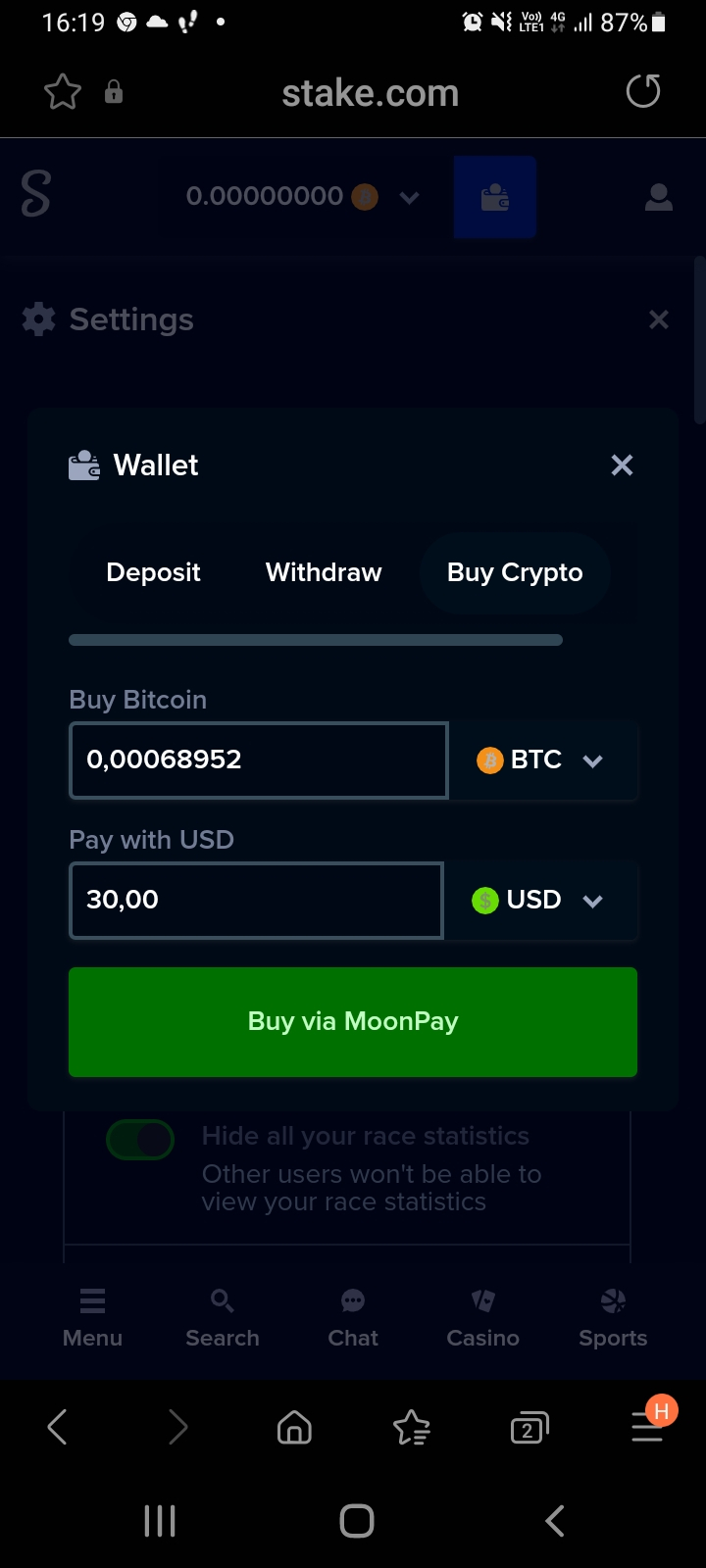 La estructura de depósitos de Stake.com es mucho más sólida de lo que suele verse en casinos con foco internacional, especialmente por la combinación entre acceso fiat simplificado y un ecosistema cripto muy amplio. Durante nuestras pruebas, la diferencia más clara frente a operadores promedio estuvo en la flexibilidad para usuarios que ya tienen fondos en wallet. Bitcoin, Ethereum, Litecoin, USDT, Tron, XRP, Dogecoin y Bitcoin Cash comparten una lógica bastante uniforme: depósito mínimo de $10, tope de hasta $50,000 por operación y costes limitados a la comisión propia de la red. Ese detalle importa mucho porque reduce la fricción y hace más previsible el coste total. En comparación, cuando la entrada se hace por Visa, Mastercard o Apple Pay a través de MoonPay, la experiencia es muy cómoda y casi instantánea, pero el cargo del tercero, alrededor del 2% al 3%, ya representa un coste de adquisición que el usuario debe considerar. Para depósitos pequeños esa diferencia puede parecer menor, pero en importes medios o altos ya se nota bastante en el valor real que llega a saldo o a wallet antes de entrar al casino.